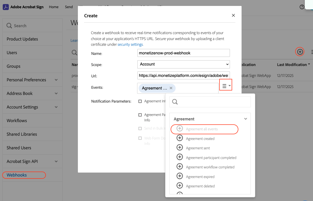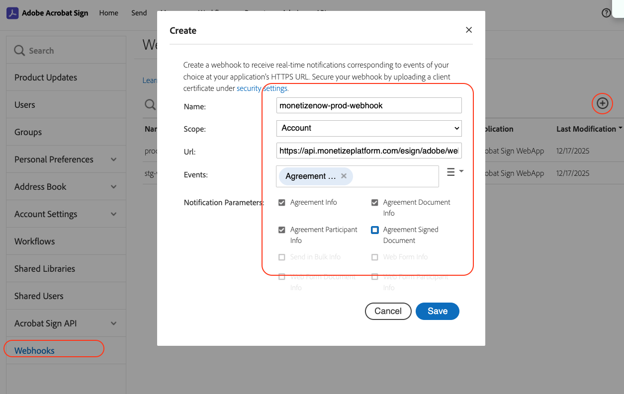 - Put the webhook url (https://api.monetizeplatform.com/esign/adobe/webhook)