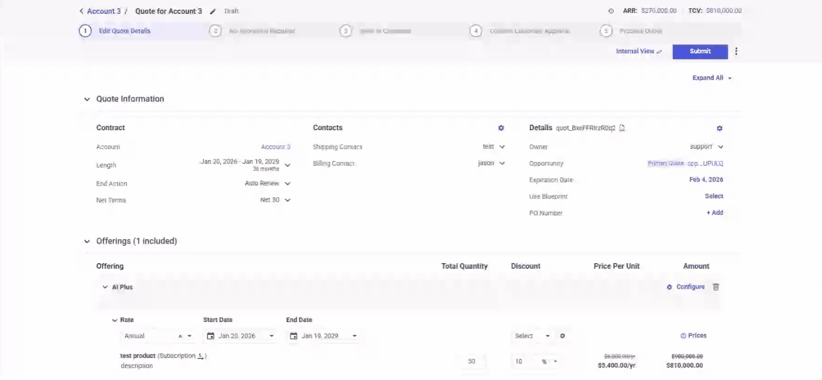 - Adjust Quote settings as needed (e.g. different billing contact, contract start date, net terms)