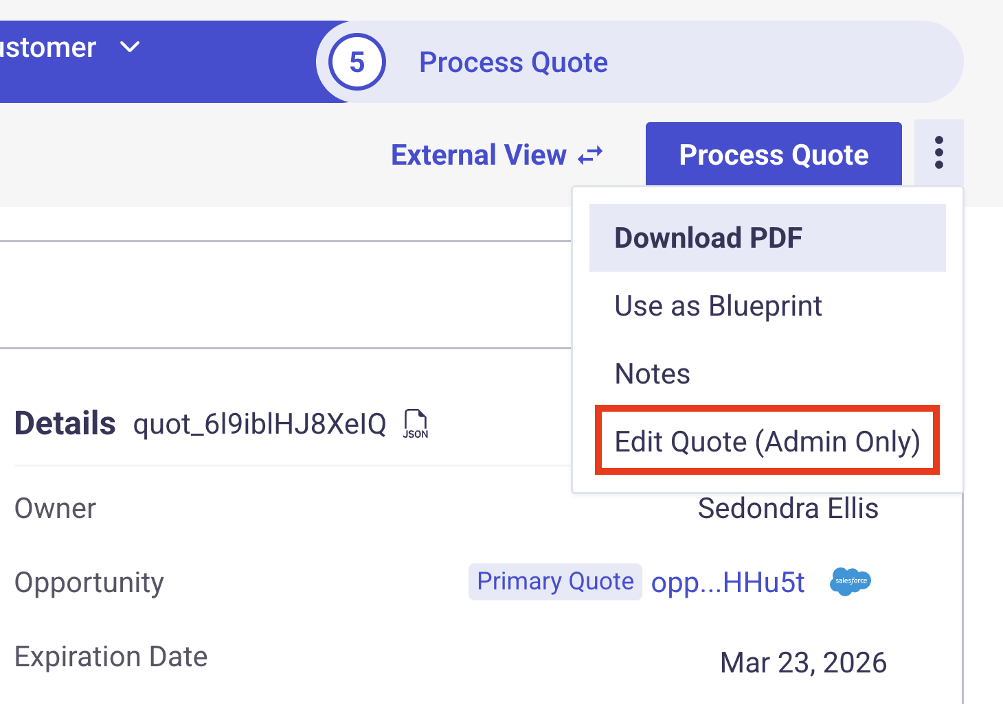 - Click the dropdown menu and select "Edit Quote (Admin Only)"