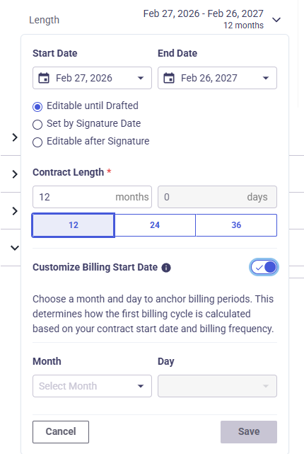 Note: Custom billing start dates are only available for new contracts, not renewals or amendments.