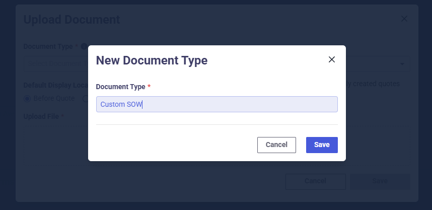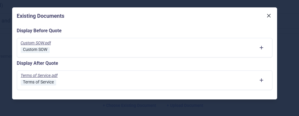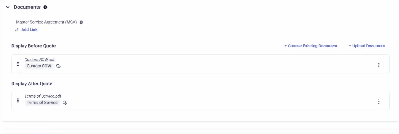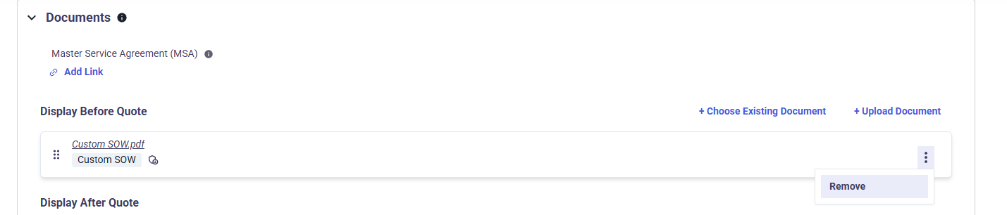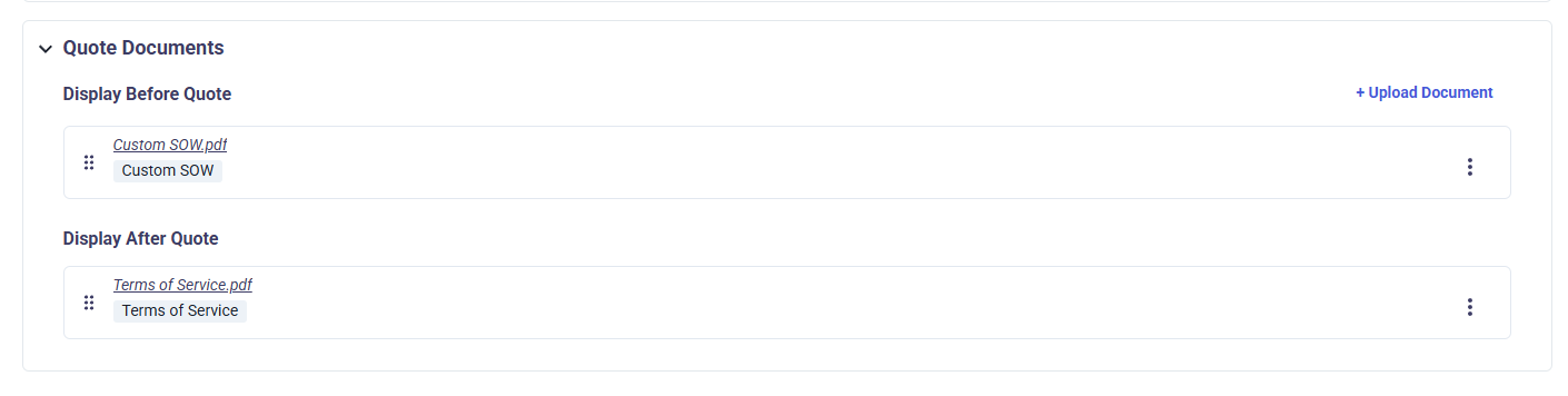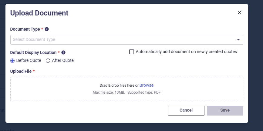 - Choose whether the document should appear before or after the Quote in the generated PDF