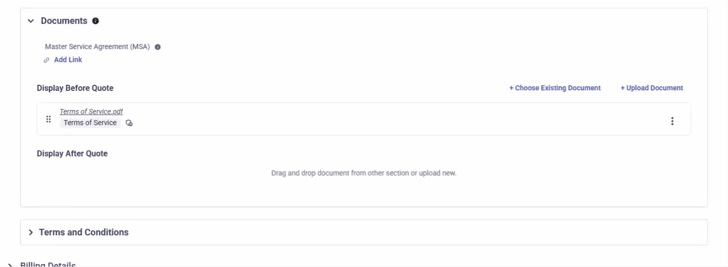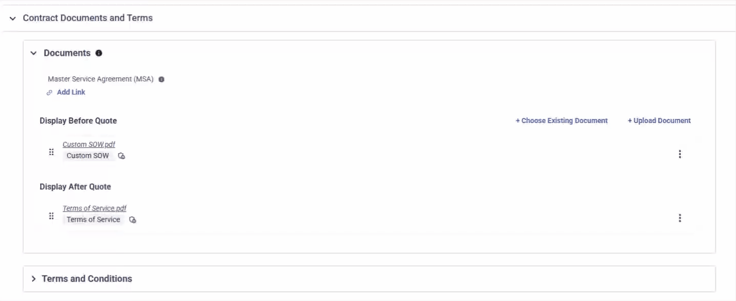 MonetizeNow allows you to manage quote-related documents across all quotes and at the Legal Entity level, giving admins centralized control while still providing flexibility for sales teams during the quoting process.