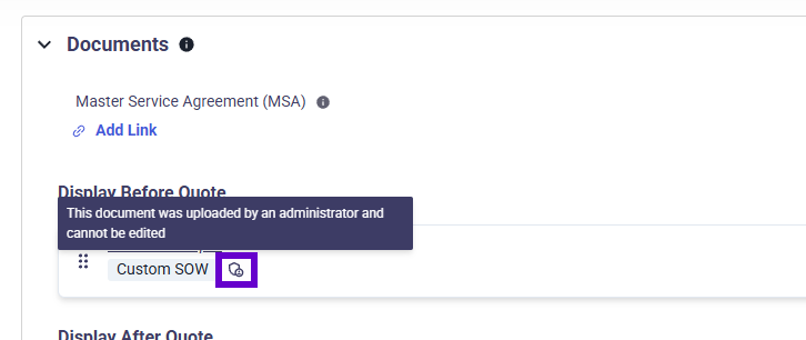 Documents that have been uploaded by an administrator cannot be edited (i.e. the core document cannot be altered regardless of if the document can be removed/added to a quote)