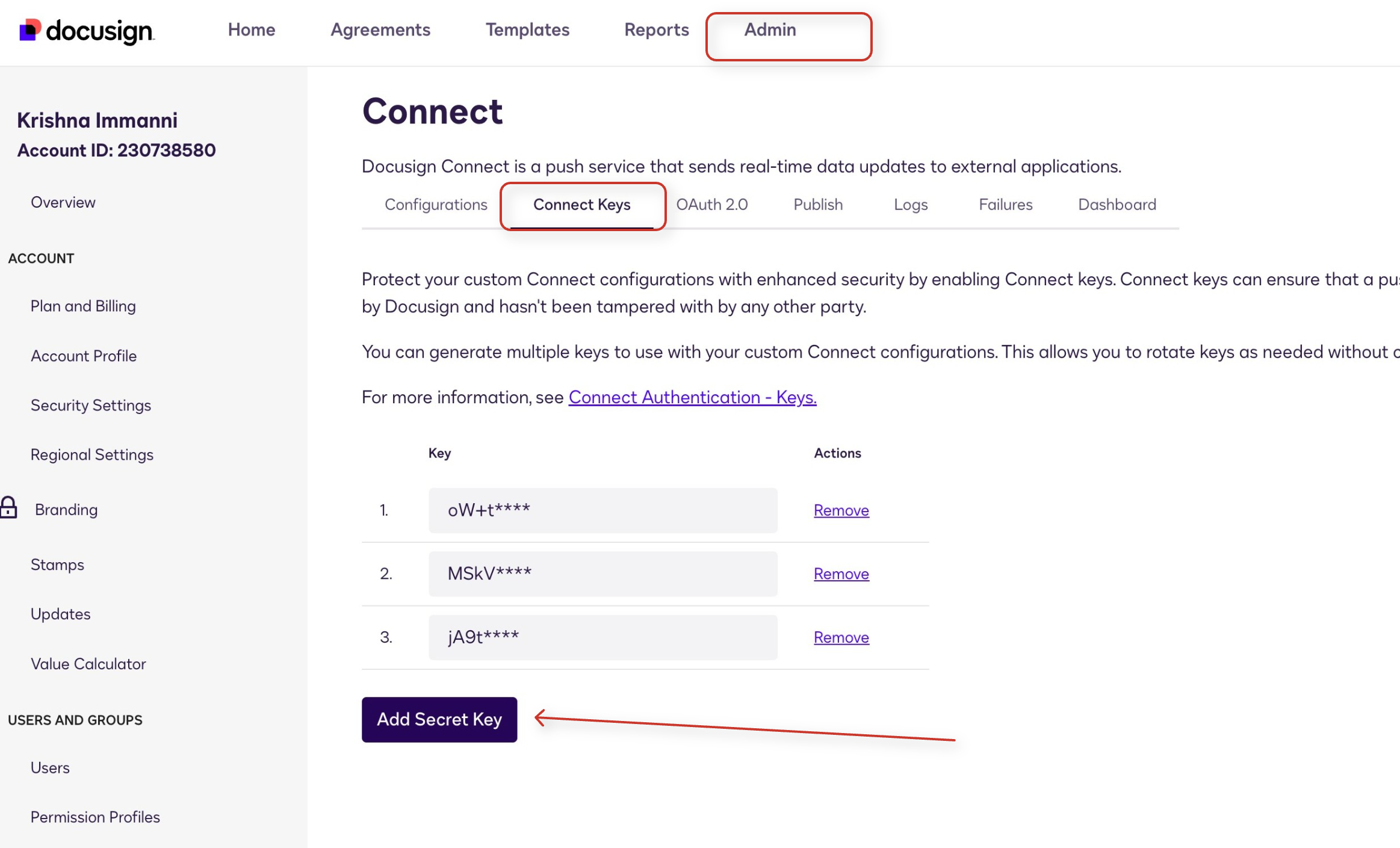 Note: If you are missing access to any of the above fields, reach out to your organization’s DocuSign Admin to retrieve them.