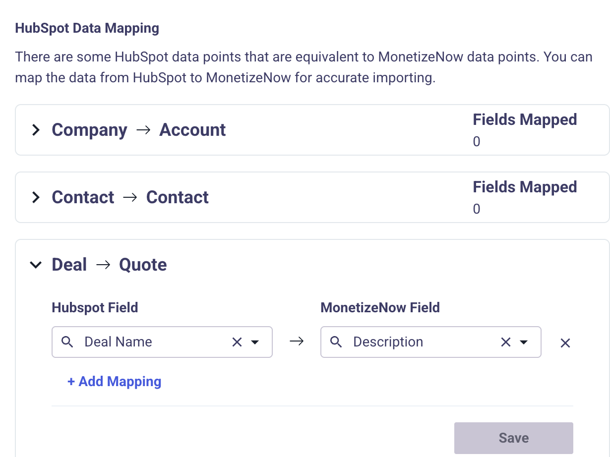 - Map a field such as Deal Name to the Quote Description (Name) field.