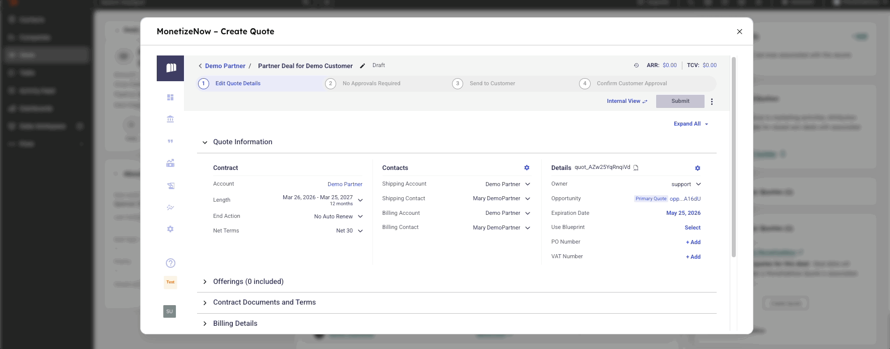The quote is always created under the primary account (primary company on the deal), but you can route billing and shipping to a linked account (such as a partner or reseller) in just a few clicks.