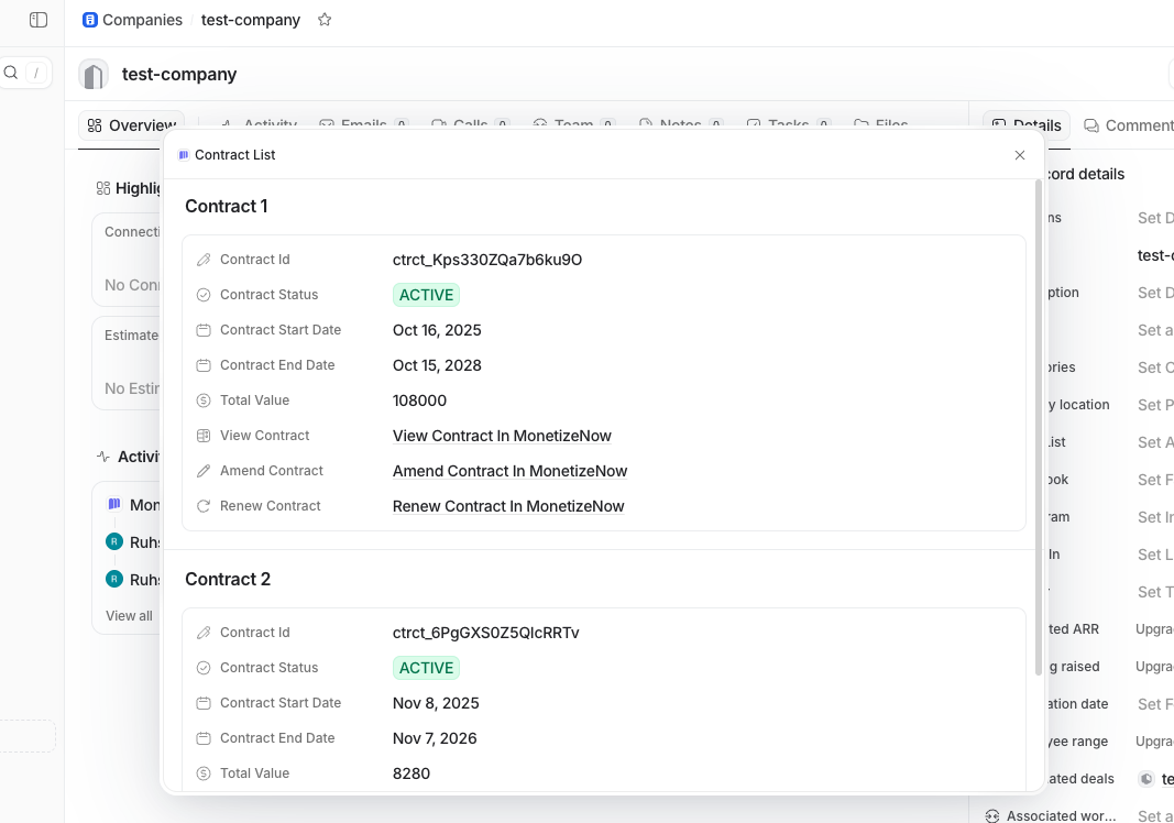 It is possible to view the list of MonetizeNow Contracts that is associated with a Attio Company. To see this, go to company deatils page. Click on the MonetizeNow app integration. If the company is associated with MonetizeNow Accounts, and if it has associated contracts, it will be displayed on a modal with link to view, amend and renew contract.