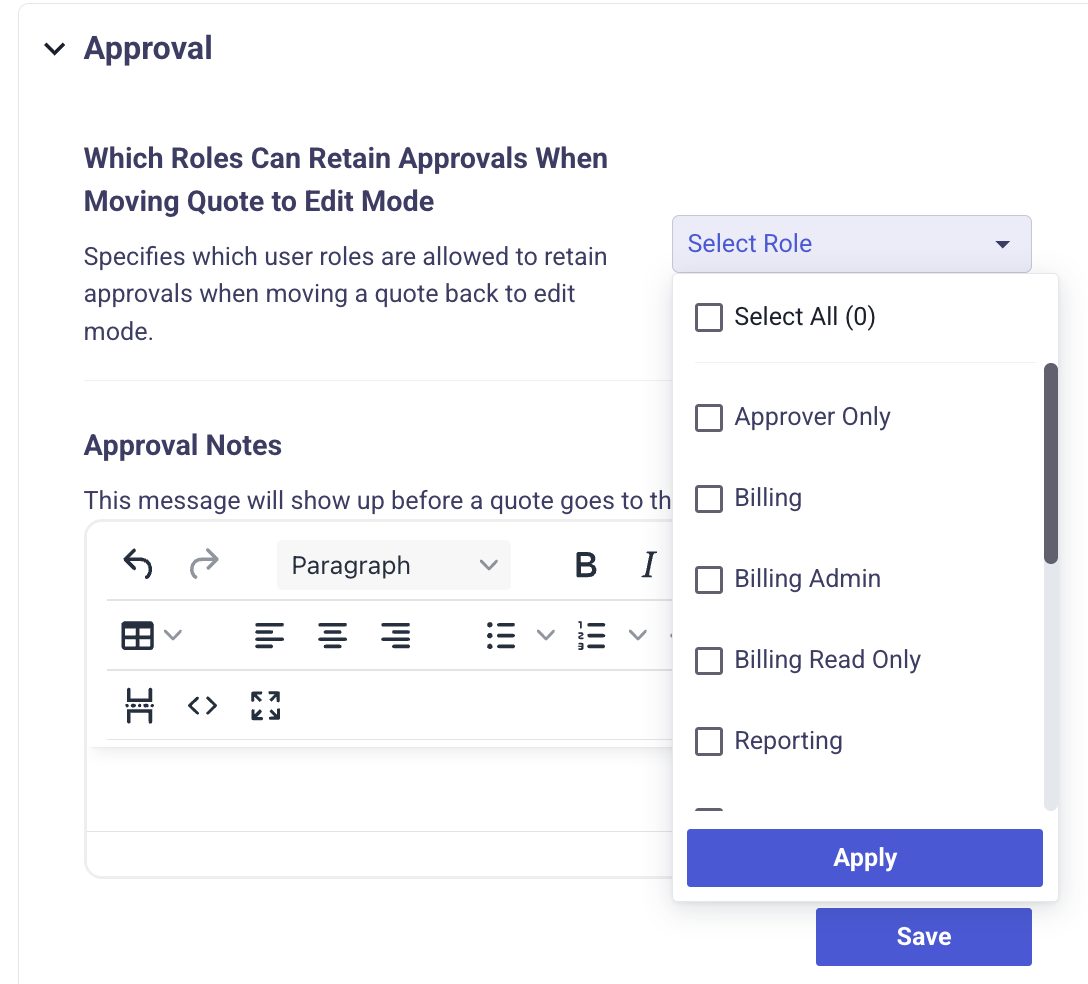 To configure this, navigate to Settings > Quote Settings and locate the Approval Retention section. From there, a Tenant Admin can select one or more roles that should be granted the ability to retain approvals.